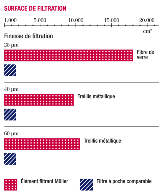 Les solutions conventionnelles courantes ne répondaient pas à nos attentes en matière de durée de vie et de pureté de fluide. L’élément filtrant interchangeable Müller est unique dans la catégorie des appareils compacts à haute pression. La surface de filtration trois fois plus grande garantit une efficacité supérieure car une surface de filtration plus importante augmente la durée de vie.